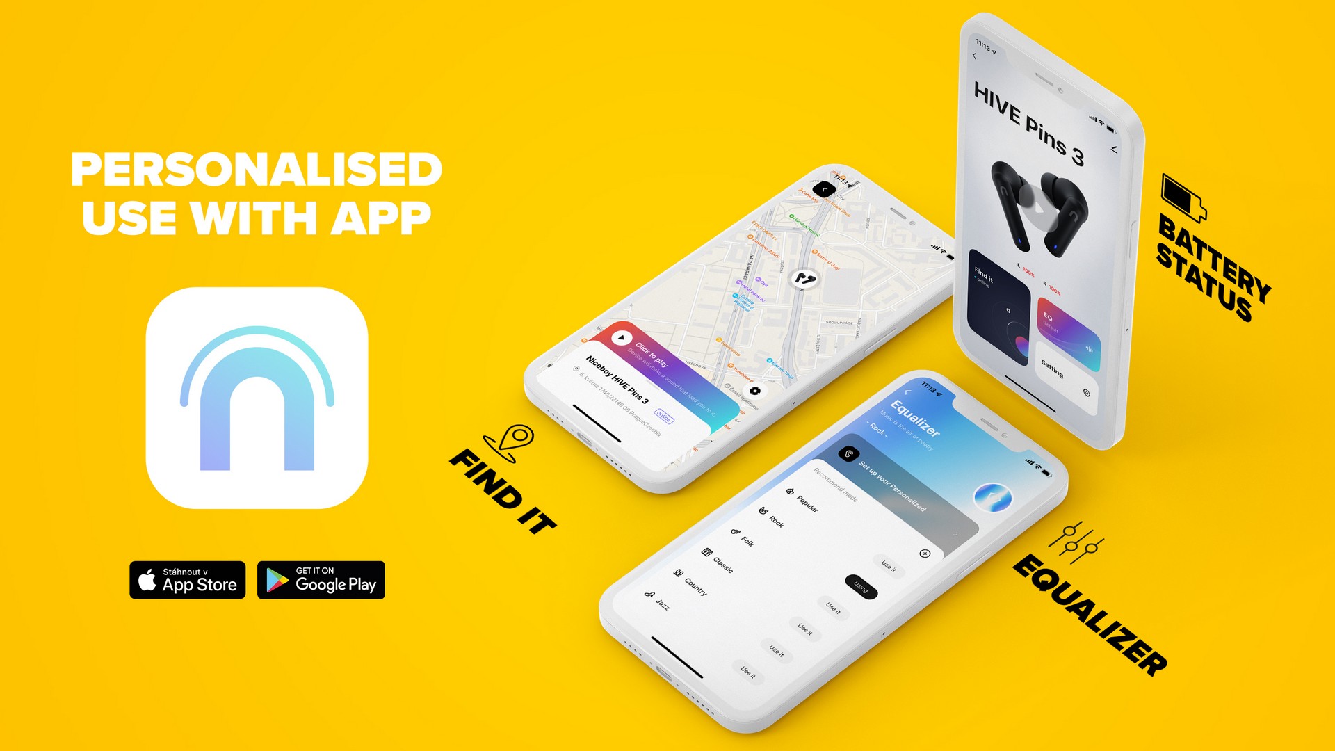 Mobilná aplikácia Niceboy ION rozširuje možnosti slúchadiel HIVE Pins 3. Pomocou ekvalizéra si nastavíte dynamiku zvuku podľa seba. Aplikácia vám pomôže slúchadlá prípadne nájsť, pretože v aplikácii vidíte na mape, kde boli k telefónu naposledy pripojené. V neposlednom rade umožňuje vlastné nastavenie ovládania alebo detailnú kontrolu stavu batérie jednotlivých slúchadiel.