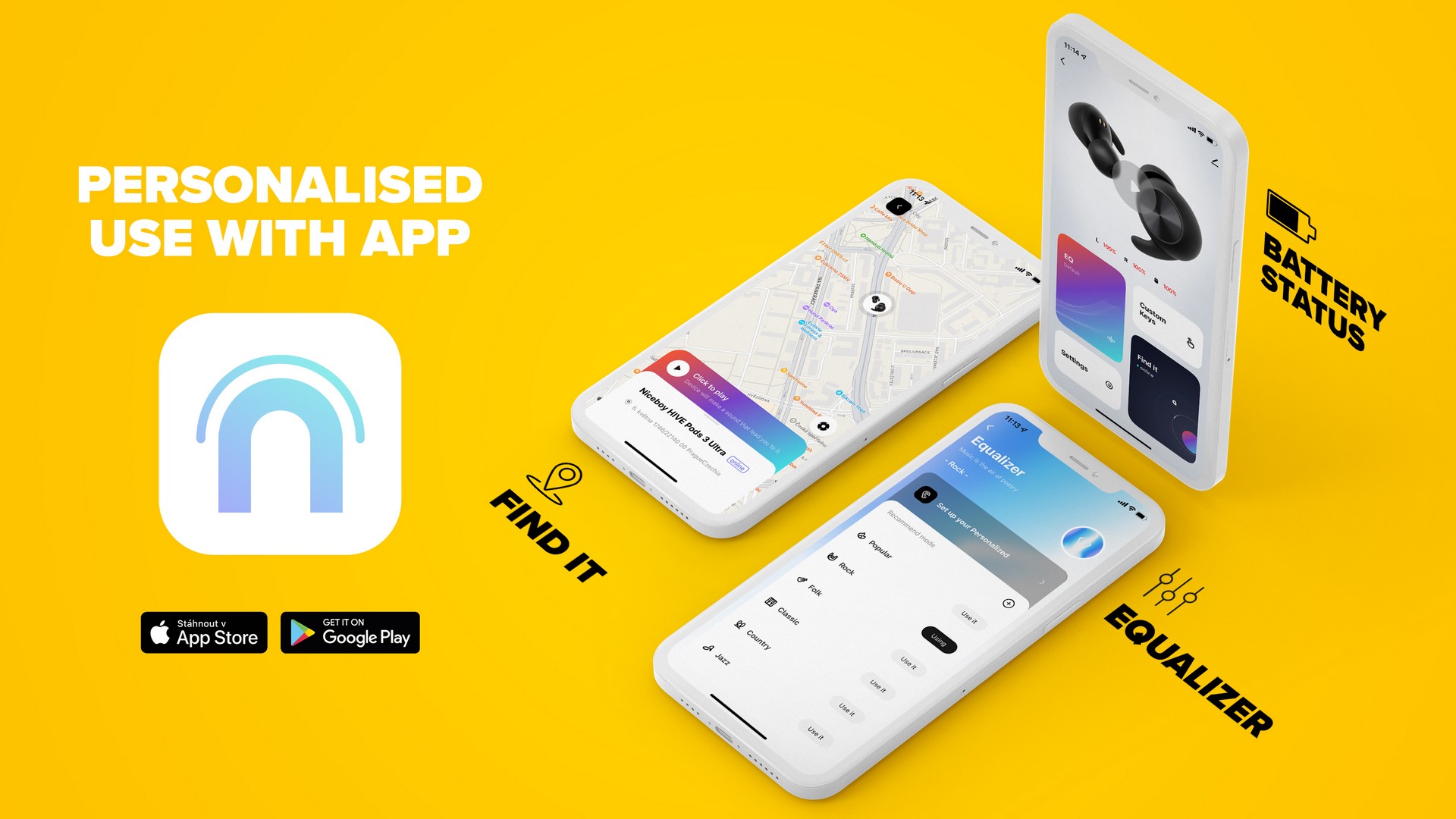 S vlastnou mobilnou aplikáciou Niceboy ION sú tu ešte ďalšie možnosti, ako si slúchadlá užiť. Napríklad s funkciou ekvalizéra si môžete nastaviť zvuk podľa seba. Aplikácia vám pomôže slúchadlá prípadne nájsť, pretože v aplikácii vidíte na mape, kde boli k telefónu naposledy pripojené. V neposlednom rade umožňuje vlastné nastavenie ovládania alebo detailnú kontrolu stavu batérie jednotlivých slúchadiel.