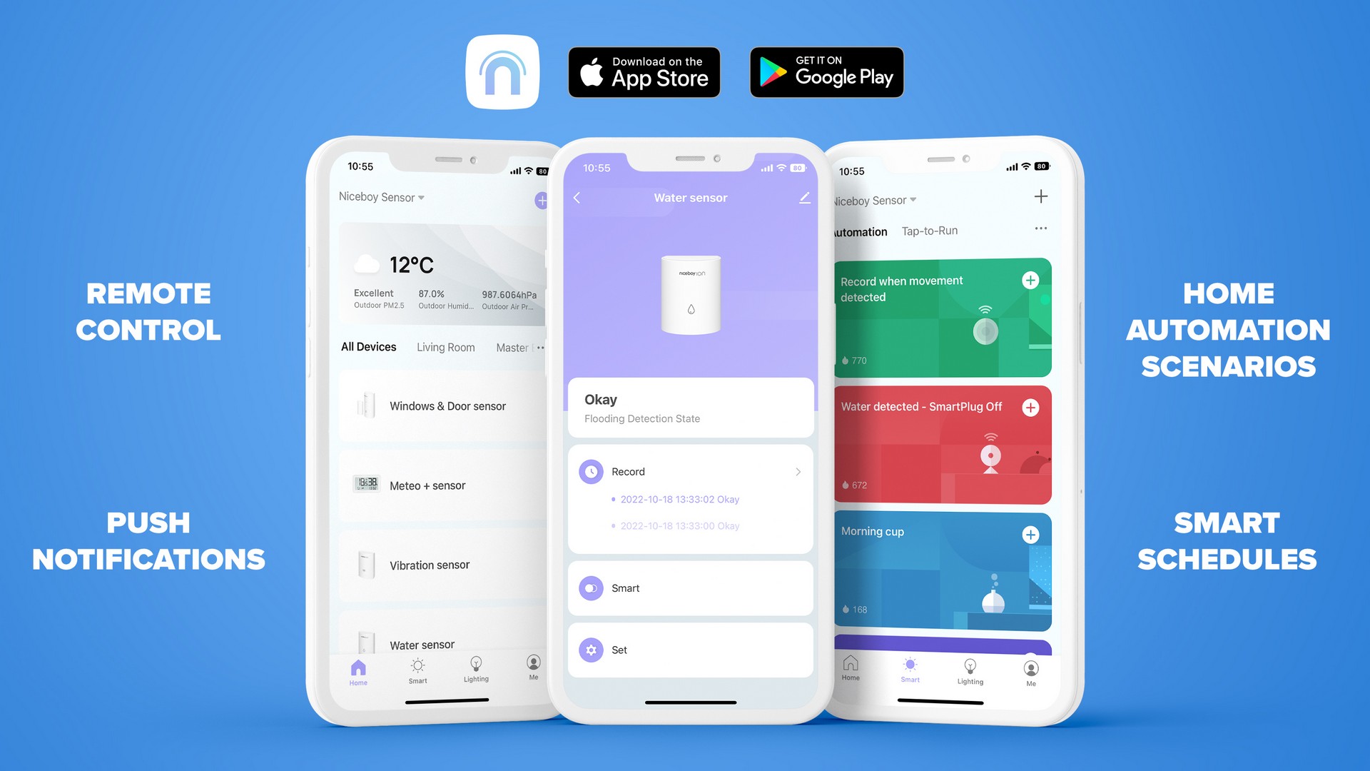 Kompletné ovládanie senzora Niceboy ION ORBIS Water Sensor nájdete v mobilnej aplikácii Niceboy ION, ktorá navyše podporuje viacero jazykov (vrátane češtiny a slovenčiny). Z aplikácie okrem senzorov ovládate aj všetky produkty inteligentnej domácnosti Niceboy ION a ich ovládanie je možné zdieľať aj medzi ostatných členov domácnosti. Zo svojho telefónu si na zariadení pohodlne nastavíte parametre, vytvoríte inteligentné scenáre, časové plány alebo zorganizujete svoje zariadenia do skupín. Zároveň inteligentné zariadenia Niceboy ION posielajú na váš telefón upozornenia a informácie o zmenách stavu, takže máte vždy prehľad, čo sa vo vašej domácnosti deje.