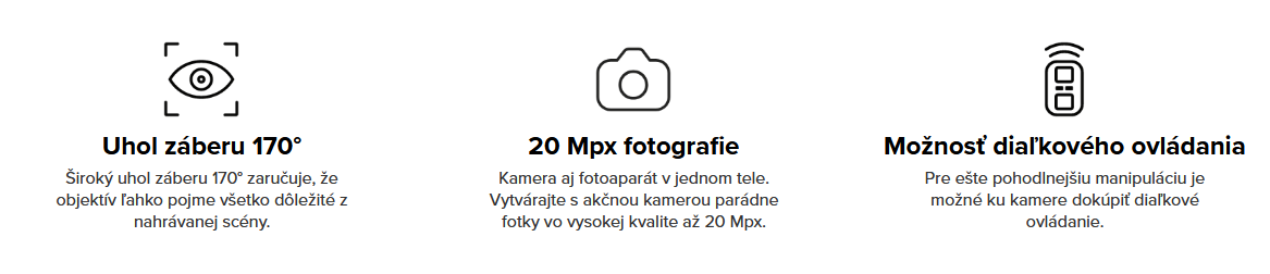 | Obsah balenia: | Kamera, Vodotesné púzdro do 30 m, Batéria, Súprava držiakov n pripojenie vodotesného obalu či kamery so statívovým závitom k ďalšiemu príslušenstvu , Nalepovací držiak na helmu |