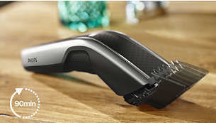 Výkonná batéria strojčeka na vlasy poskytuje až 90 minút bezdrôtovej prevádzky po 1 hodine nabíjania. Poskytuje maximálny výkon a slobodu.