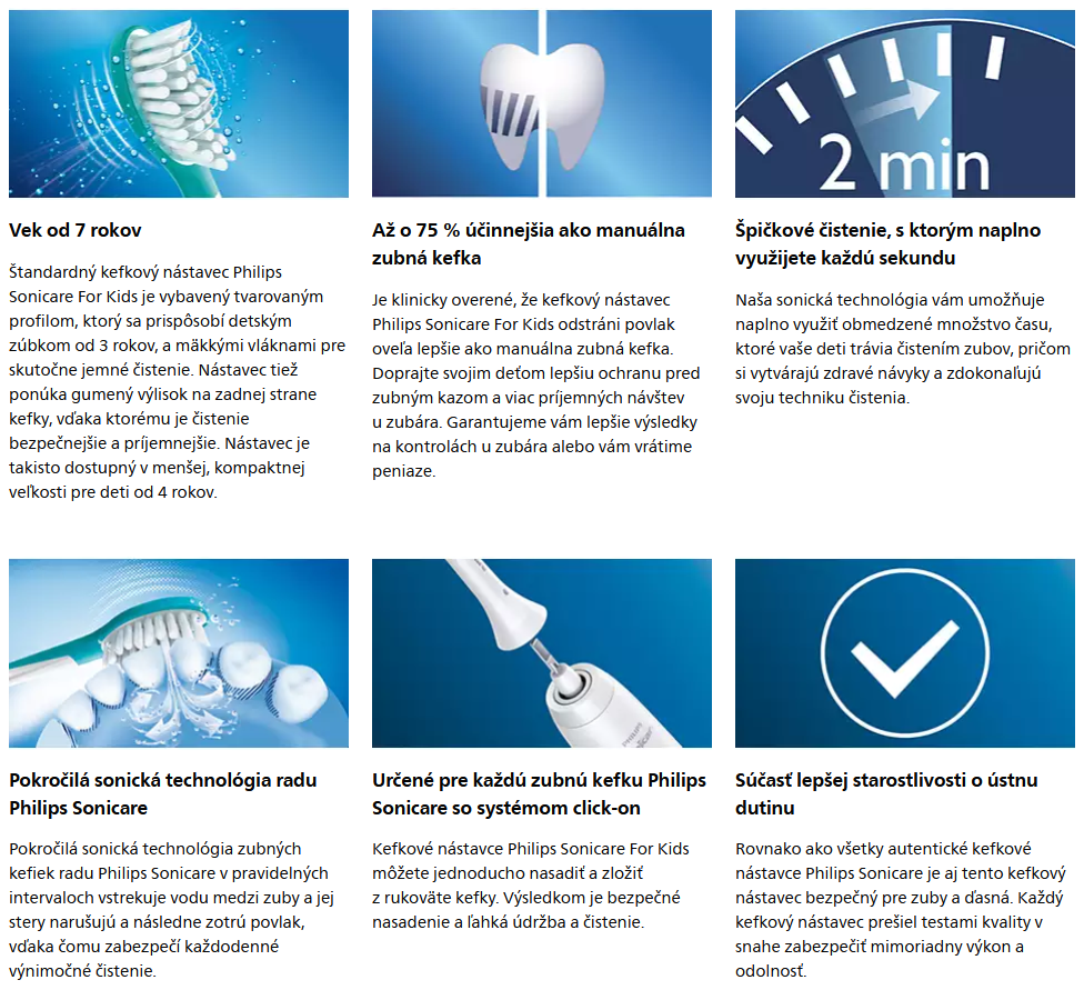 Kefkový nástavec pre deti Sonicare For Kids predstavuje dokonalé riešenie v starostlivosti o detský chrup. Funguje výhradne s elektrickou zubnou kefkou For Kids, s ktorou sa spoločne postarajú o to, aby bolo čistenie zubov pre vaše dieťa nielen bezpečné a príjemnejšie, ale aby zábavnou formou napomáhalo vytváraniu zdravých návykov v starostlivosti o detský chrup.
