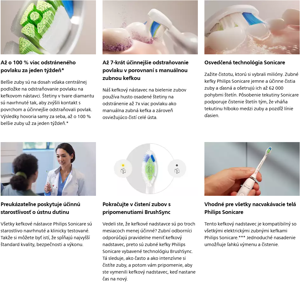 Dosiahnite žiarivejší úsmev s týmto klinicky testovaným náhradným kefkovým nadstavcom na bielenie zubov od Philips Sonicare. Zaznamenajte výsledky už po jednom týždni a zároveň si vychutnávajte výnimočné každodenné čistenie.