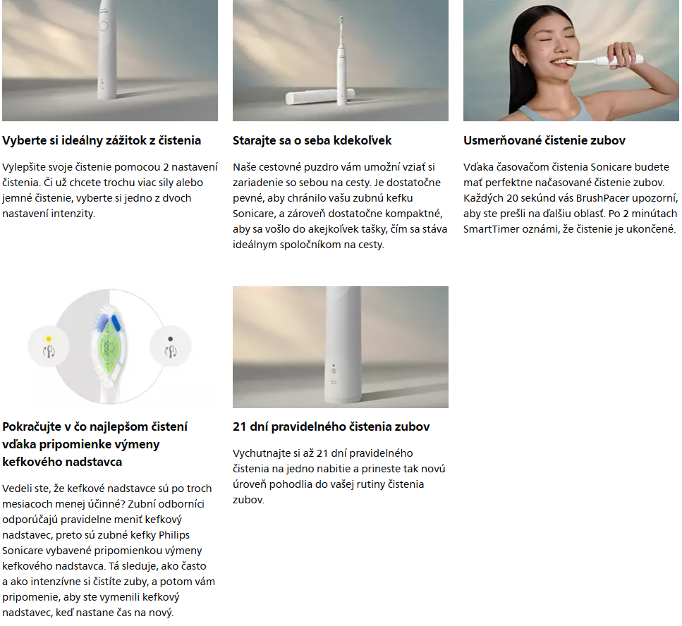 Zreteľné výsledky na dosah ruky s belšími zubami, odstraňuje 10-krát viac povlaku*. Obsahuje technológiu Sonicare novej generácie na výkonné a súčasne jemné čistenie aj na ťažko dostupných miestach.