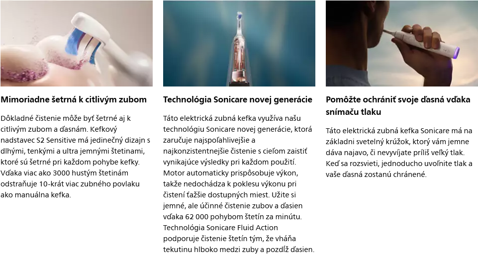 Aj dôkladné čistenie citlivých zubov a ďasien môže byť jemné, odstraňuje 10-krát viac povlaku*. Obsahuje technológiu Sonicare novej generácie pre výkonné a súčasne jemné čistenie aj na ťažko dostupných miestach.