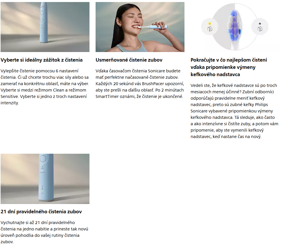 Aj dôkladné čistenie citlivých zubov a ďasien môže byť jemné, odstraňuje 10-krát viac povlaku*. Obsahuje technológiu Sonicare novej generácie pre výkonné a súčasne jemné čistenie aj na ťažko dostupných miestach.