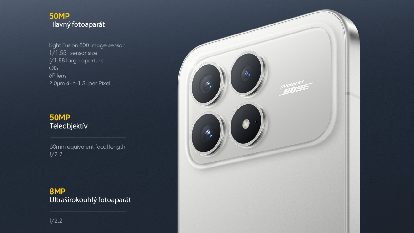POCO F8 Pro využíva všestranný modul troch fotoaparátov na čele s hlavným 50MP snímačom s OIS a clonou f/1.88. Spolu s ním je vybavený aj praktickým 50MP telefoto objektívom s clonou f/2.2 a ultraširokouhlým fotoaparátom s clonou f/2.2.