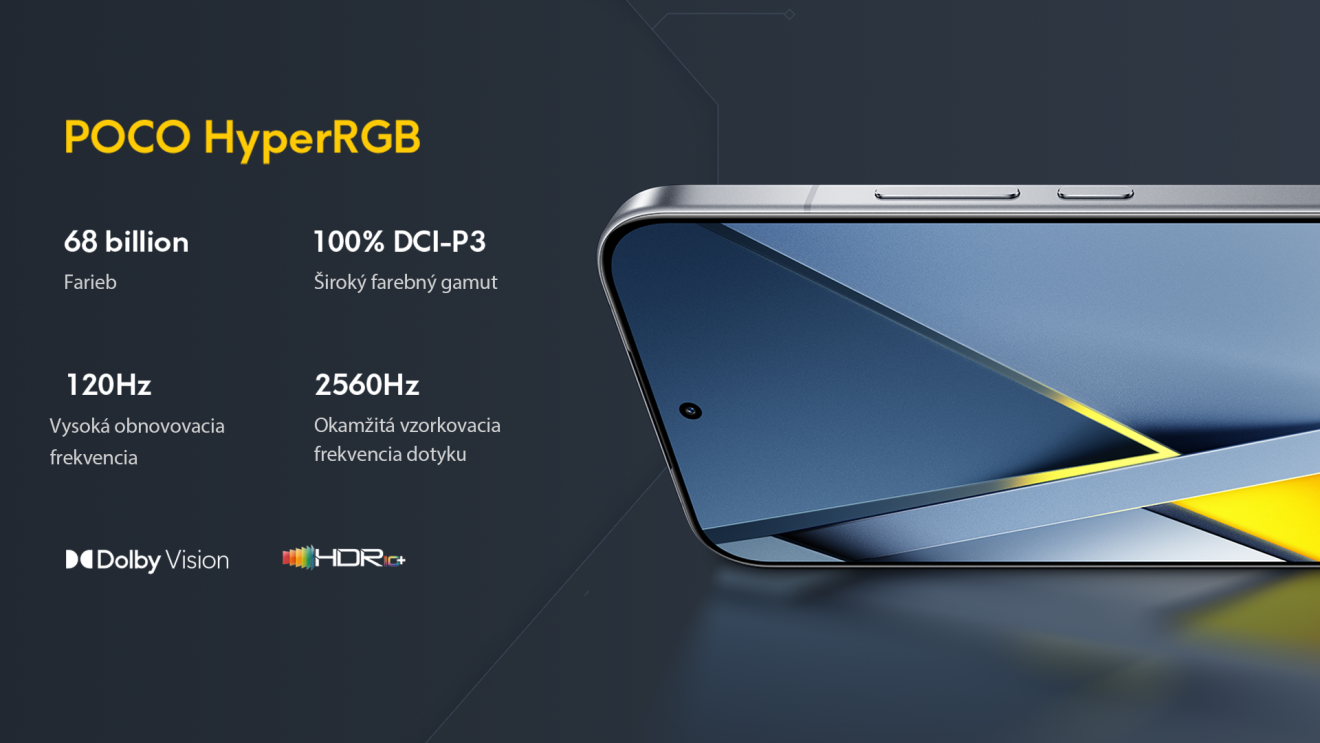 POCO HyperRGB využíva štruktúru subpixelov v plnom RGB rozsahu, vďaka čomu naplno využíva červené, zelené a modré subpixely. Poskytuje ostrý a farebne presný vizuálny zážitok porovnateľný s rozlíšením 2K, pričom si udržiava o 19,5% nižšiu spotrebu energie v porovnaní s predchádzajúcou generáciou. Tento vynikajúci displej ponúka 68 miliárd farieb, 100% DCI-P3 farebný rozsah, 120Hz obnovovaciu frekvenciu, 2560 Hz okamžitú vzorkovaciu frekvenciu dotyku a podporu Dolby Vision a HDR 10+.