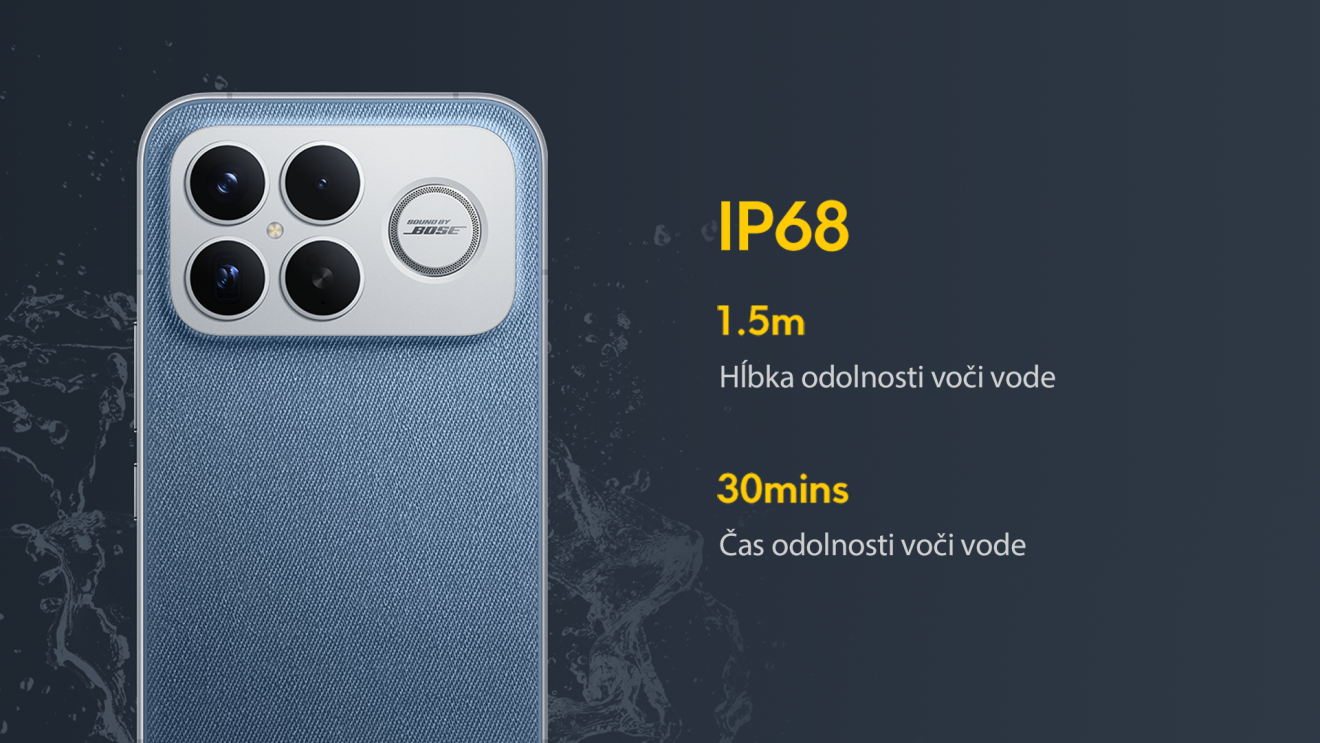 *Zariadenie bolo testované a certifikované ako odolné voči striekajúcej vode, vode a prachu za špecifických laboratórnych podmienok s klasifikáciou IP68 na základe normy IEC 60529:1989+A1:1999+A2:2013. Upozorňujeme, že testovacie podmienky odolnosti voči vode zahŕňajú: ponorenie do statickej sladkej vody do hĺbky 1,5 metra, až na 30 minút, s teplotným rozdielom medzi vodou a produktom 5K alebo menej. Takáto odolnosť voči vode sa týka iba špecifických podmienok testovaných v laboratórnom prostredí, ktoré nezodpovedajú bežným podmienkam používania spotrebiteľmi. Preto nie je zaručená ochrana proti vniknutiu, ak je produkt vystavený podmienkam, ktoré presahujú testovacie podmienky. Neodporúča sa používať na pláži alebo v bazéne. Ochrana proti vniknutiu sa môže zhoršiť v dôsledku každodenného opotrebenia, fyzického poškodenia a/alebo demontáže potrebnej v prípade opravy. Záruka sa nevzťahuje na poškodenie spôsobené tekutinou.