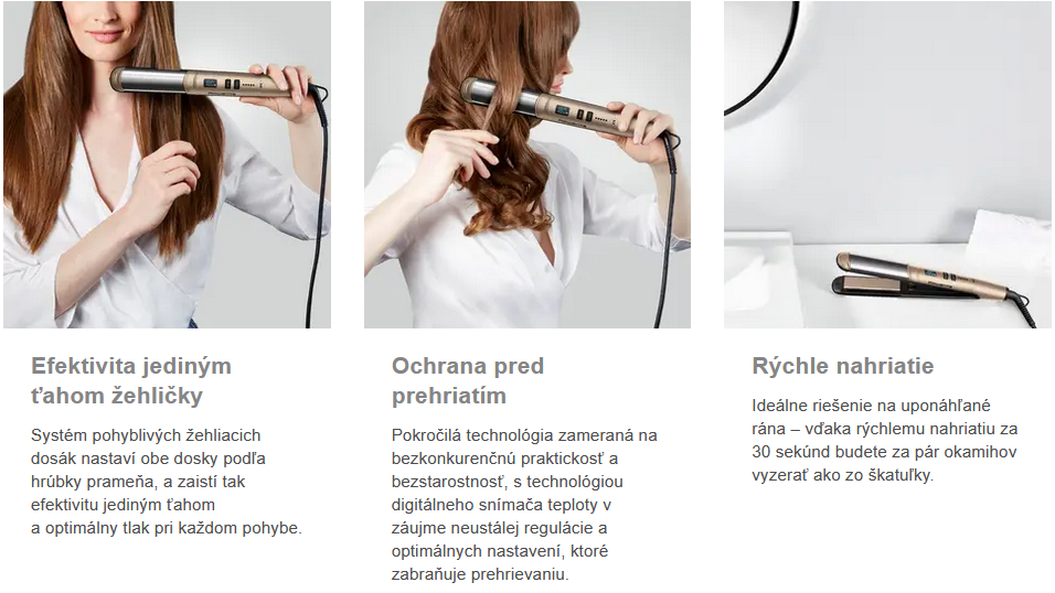 Niečo navyše: Žehlička disponuje systémom pohyblivých dosiek, ktorý automaticky upraví obe dosky podľa hrúbky prameňa. Vďaka tomu budete môcť svoje vlasy efektívne upraviť aj jediným ťahom.