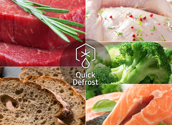 Funkcia Quick Defrost vám umožní rozmraziť jedlo rýchlo a rovnomerne. Potraviny si tak uchovajú svoju čerstvosť i tvar a umožnia vám vychutnať si delikátne mäso, hydinu, ryby, chlieb, koláče alebo ovocie, kedykoľvek len budete chcieť.