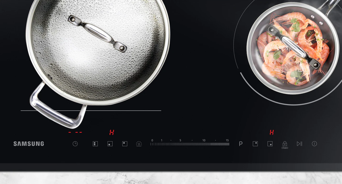 Extra široké a intuitívne posuvné ovládanie indukčnej varnej dosky Samsung umožňuje rýchlu a presnú reguláciu teploty pri varení. Dotknite sa a jazdite prstom po LED ovládacom paneli a okamžite nastavte alebo upravujte úroveň tepla pre každú varnú dosku.