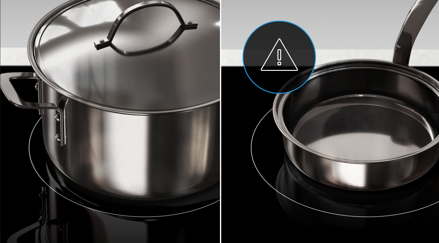 Len čo hrniec alebo panvicu umiestnite na dosku, detektor okamžite vyhodnotí, či je daný priemer a veľkosť vhodný pre danú zónu. Keď budú zakrývať menej ako 60 % zóny, upozorní vás správou na použitie iného riadu.
