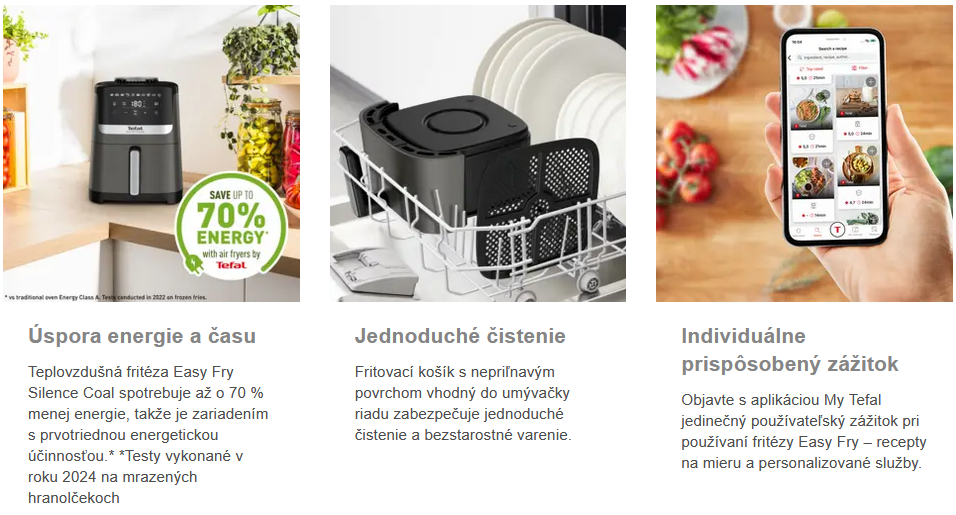 Objavte teplovzdušnú fritézu Tefal Easy Fry Silence, najtichšiu teplovzdušnú fritézu* navrhnutú pre dokonalé jedlá a pokoj v kuchyni. Vychutnajte si bezstarostné fritovanie s našou exkluzívnou tichou technológiou Tefal pre úplnú pohodu v kuchyni. 10 prednastavených programov poskytuje nepreberné množstvo možností prípravy pokrmov, má dotykový displej s intuitívnym ovládaním a ďalšie výhody. To všetko v teplovzdušnej fritéze, ktorá spotrebuje o 70 % menej energie ako tradičná rúra.**