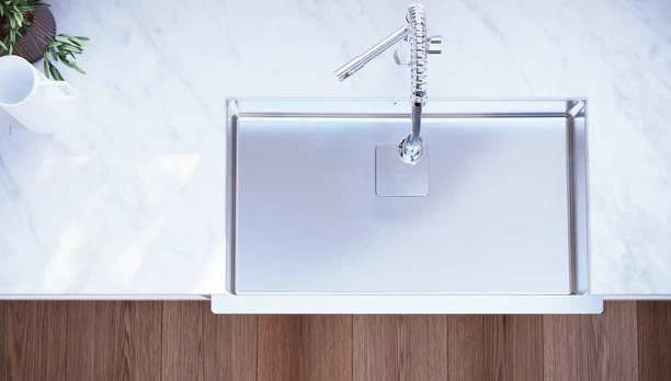 Hornú časť jednoducho zasuňte do pripraveného výrezu a okraj drezu bude sedieť v jednej rovine s pracovnou doskou. Drezy Teka možno namontovať prakticky na akúkoľvek pracovnú dosku. Drez je k pracovnej doske pripevnený zospodu, nie sú viditeľné žiadne skrutky.