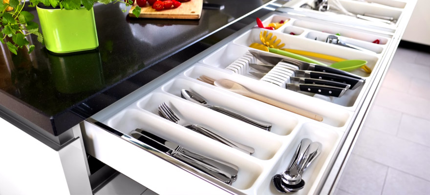 Príbory, kuchynský riad, drobné pomôcky, kávové kapsuly alebo čajové vrecká sú v zostavách zásobníka uložené stabilne, prehľadne a s maximálnou úsporou miesta.