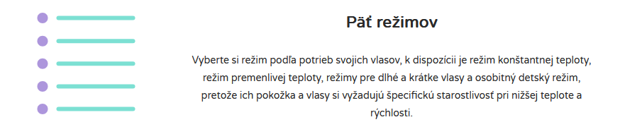 Počet režimov: Režim stálej teploty, Režim premenlivej teploty,Detský režim, Režim pre dlhé vlasy, Režim pre krátke vlasy