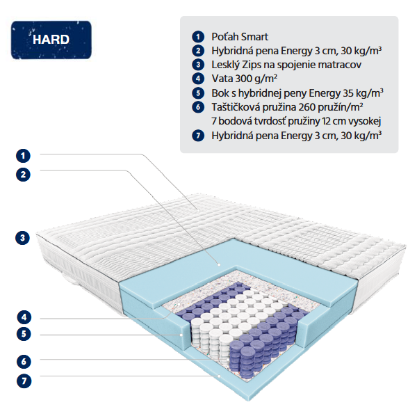 | Zloženie matracového jadra: | Taštičková pružina, Hybridná pena Energy, Vata |