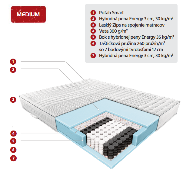 Klasický taštičkový matrac s penou vo veľmi dobrej cene je určený pre ľudí, ktorý hľadajú strednú tvrdosť na podporu chrbta. Doporučujeme ich pre páry alebo seniorov. Trvalá univerzálna konštrukcia sa správa, tak že tento matrac je vhodný nielen pre domáce použitie, ale tiež pre hotely, penzióny alebo priestory na prenájom. Základ matraca je taštičková pružina, ktorá je použitá v matraci 7 druhou tvrdosti, vďaka ktorej dokonale kopíruje chrbticu človeka.