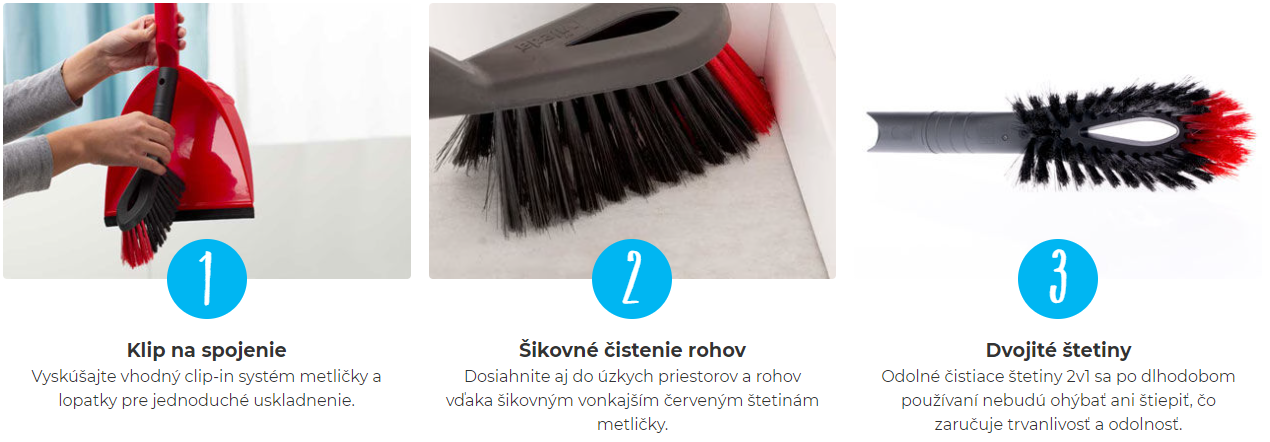 Pre vaše pohodlie obsahuje sada zmetáčiku a lopatky Vileda ergonomickú rukoväť pre ľahkú manipuláciu a intuitívny Clip-in systém, ktorý Vám umožní ľahko zasunúť zmetáčik do lopatky pre kompaktné a praktické skladovanie.