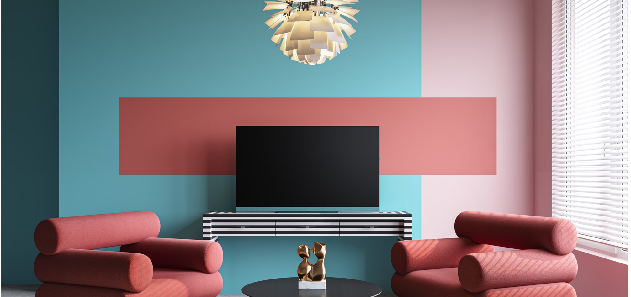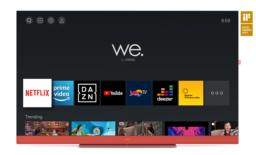 Dizajnéri pre tkaninu soundbaru, spodný zadný kryt* a stolný stojan starostlivo vybrali búrkovú sivú, vodovú modrú a koralovo červenú farbu, aby sa tento smart televízor dostal do centra pozornosti. Ladiaci čierny bočný rám a horný zadný kryt* s klasickou kovovou povrchovou úpravou dotvárajú vzhľad a vytvárajú 360° ocenený dizajn, ktorý je dokonale tvarovaný z každého uhla. Vďaka šikovnému spravovaniu káblov sú konektory a káble skryté za zadným krytom. Významné detaily ako štýlový kovový stolný stojan, charakteristické LED svetelné body alebo štítok We. by Loewe jasne spájajú we. SEE s rodinou Loewe a robia tak vzhľad skutočne jedinečným a okamžite vylepšíte každú domácnosť.