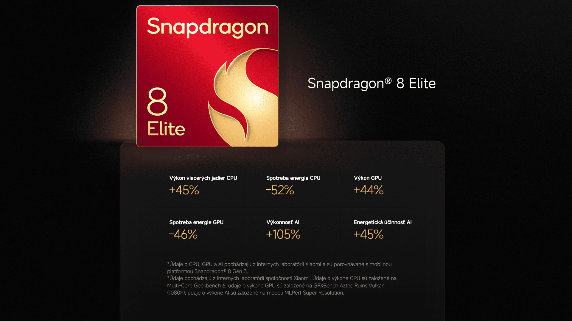 Xiaomi 15 je vybavený špičkovým mobilným procesorom Snapdragon® 8 Elite s 3nm výrobným procesom a procesorom Oryon, ktorý poskytuje vynikajúci výkon a zároveň vyváženú spotrebu energie a každodennú výdrž batérie. Ponúka 45% zvýšenie viacjadrového výkonu CPU, 44% zvýšenie grafického výkonu GPU a výrazné 52% zníženie spotreby energie. Veľkou prednosťou Snapdragonu 8 Elite, je 105% nárast výpočtového výkonu v oblasti AI a súvisiacich procesoch.