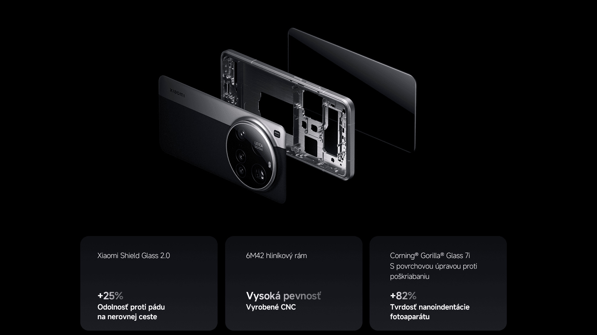 Xiaomi 15 Ultra je vybavený novou generáciou konštrukcie Xiaomi Guardian Structure, vyrobenou s prepracovanými detailmi, ako je nový tvar vysokopevnostného hliníkového rámu zo zliatiny 6M42, dekoratívny modul fotoaparátu chránený tvrdeným sklom Corning® Gorilla® Glass 7i a odolná zadná strana, čo používateľom poskytuje pocit istoty a prvotriednu odolnosť.