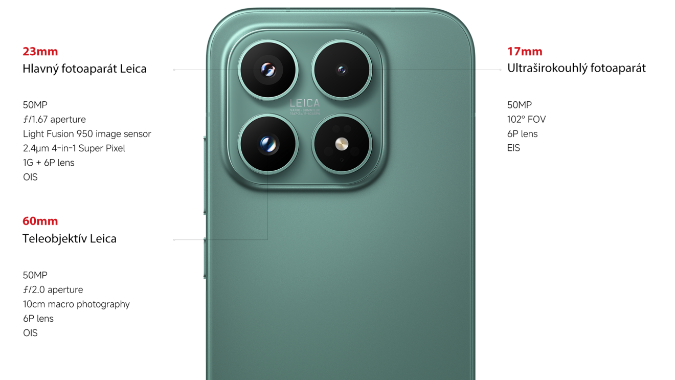 Zoznámte sa s trojicou fotoaparátov Leica na čele s hlavným 50MP fotoaparátom so snímačom Light Fusion 950 a 23mm objektívom (ƒ/1.67, OIS). Ten dopĺňa 60mm plávajúci telefoto objektív Leica s rozlíšením 50MP (ƒ/2.0, OIS) a 50MP ultraširoký fotoaparát so 17mm objektívom (102° FOV, EIS).