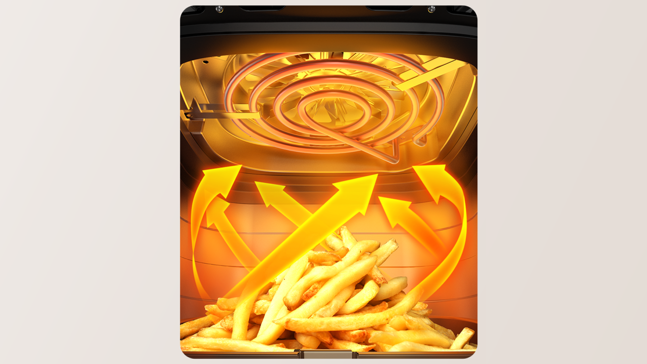 Zabudnite na obracanie! Unikátny špirálový ventilátor a 3D cyklónový ohrev zabezpečia 360° prúdenie horúceho vzduchu. Výsledkom je chrumkavé a rovnomerne prepečené jedlo pripravené úplne bez námahy.