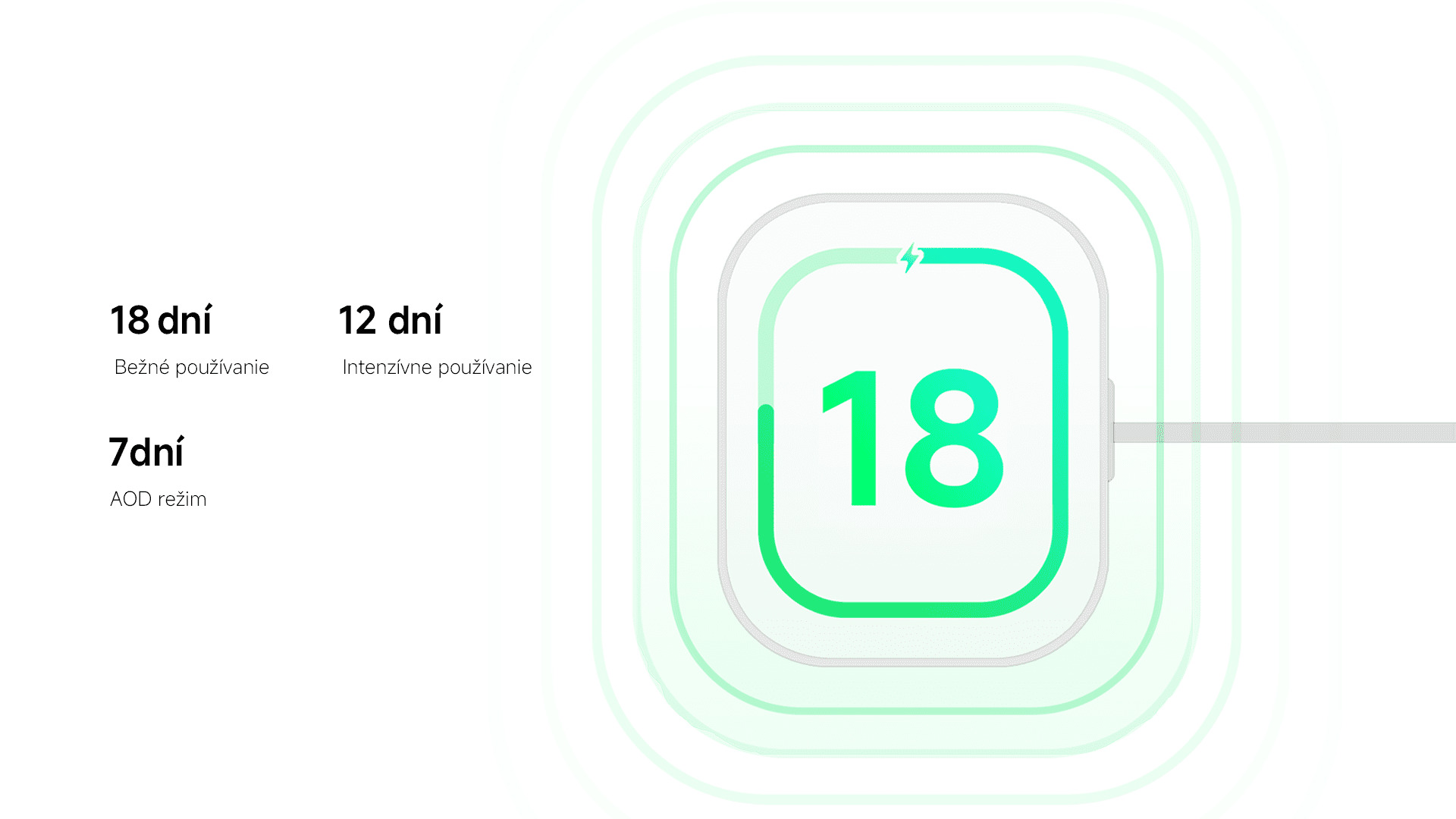 Batéria s kapacitou 470mAh, vydrží až 18 dní bežného používania. Môžete tak zabudnúť na stres z častého nabíjania a vychutnajte si pokoj a pohodu v prírode aj na cestách. Ak patríte medzí náročnejší používateľov, môžete sa tešiť až na 12 dní výdrže batérie a na 7 dní v režime AOD.