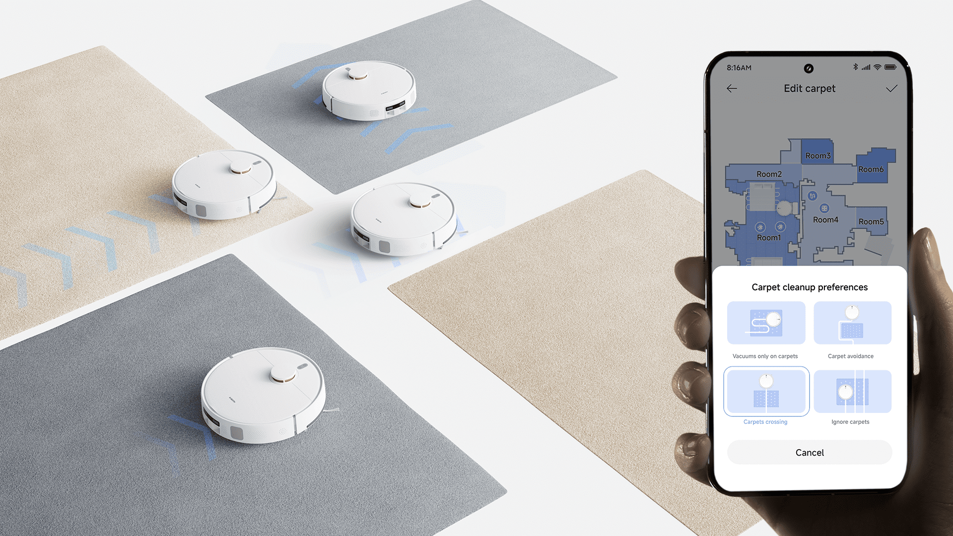 Máte v domácnosti koberce a bojíte sa že vysávač si s nimi nebude vedieť poradiť? S Robotickým vysávačom Xiaomi Robot Vacuum H40, si už nemusíte robiť starosti. Sami si totižto nastavíte ako sa má vysávač v okolí kobercov správať. Ponúka dôkladné hĺbkové čistenie s dvoma prechodmi a silným sacím výkonom pre efektívne vysávanie kobercov. V aplikácii Xiaomi Home si sami vyberiete či má vysávač koberec povysávať, prejsť, vyhnúť sa mu alebo vysávať iba koberce samostatne. *Bočná kefa proti zamotávaniu nie je vhodná na čistenie kobercov. Na čistenie kobercov ju prosím nahraďte bežnou bočnou kefou.