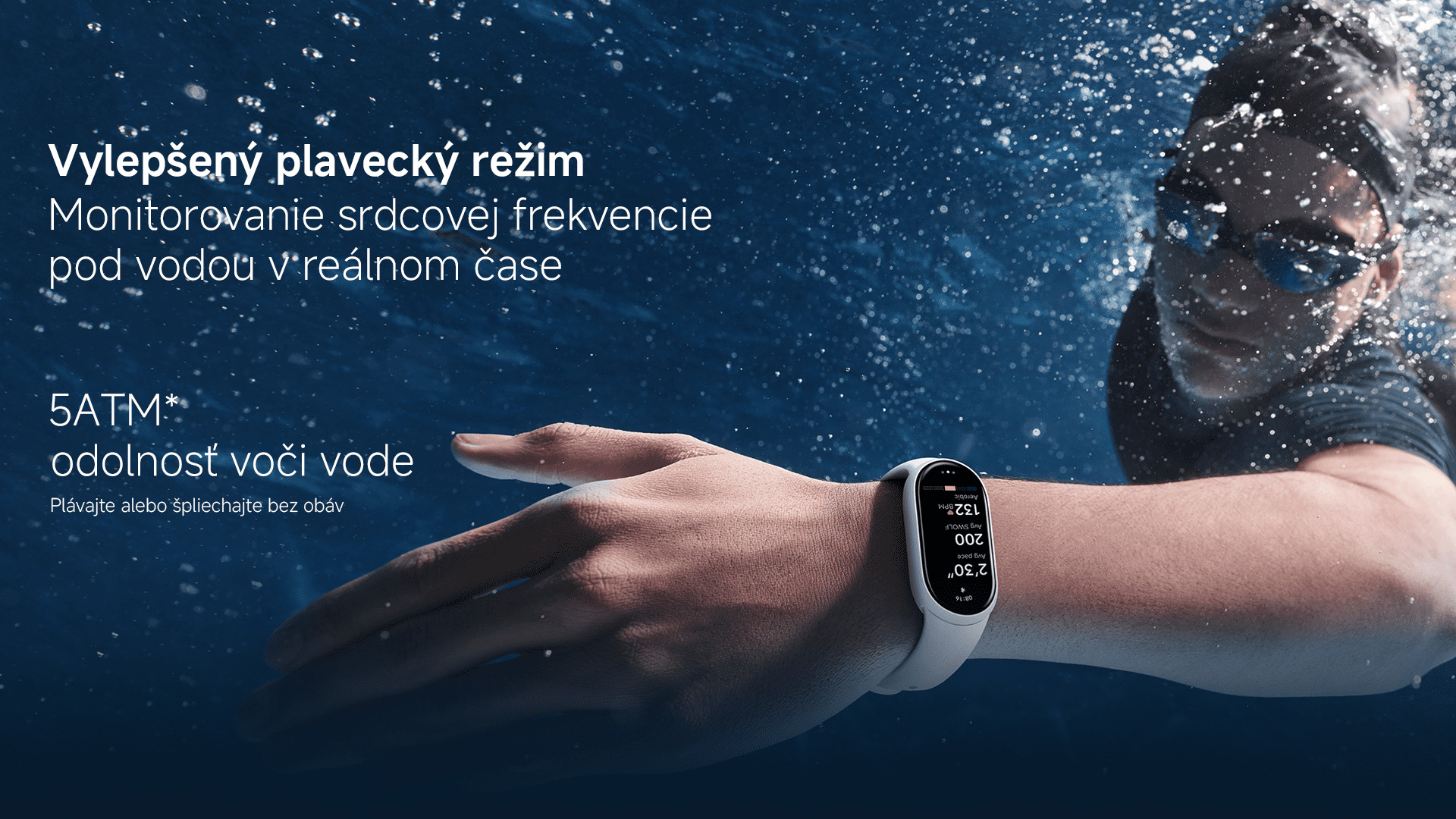 Vďaka vylepšenému deväťosovému snímaču a technológii rozpoznávania záberov, vylepšenej umelou inteligenciou, dosahuje 96% presnosť pri sledovaní počtu okruhov. Inteligentný náramok Xiaomi, teraz prvýkrát podporuje aj monitorovanie srdcovej frekvencie počas plávania a prináša komplexnejšie údaje pre plavecký tréning. *Náramok nie je vhodné používať v horúcej sprche, horúcich prameňoch, saunách alebo pri rýchlych vodných športoch.