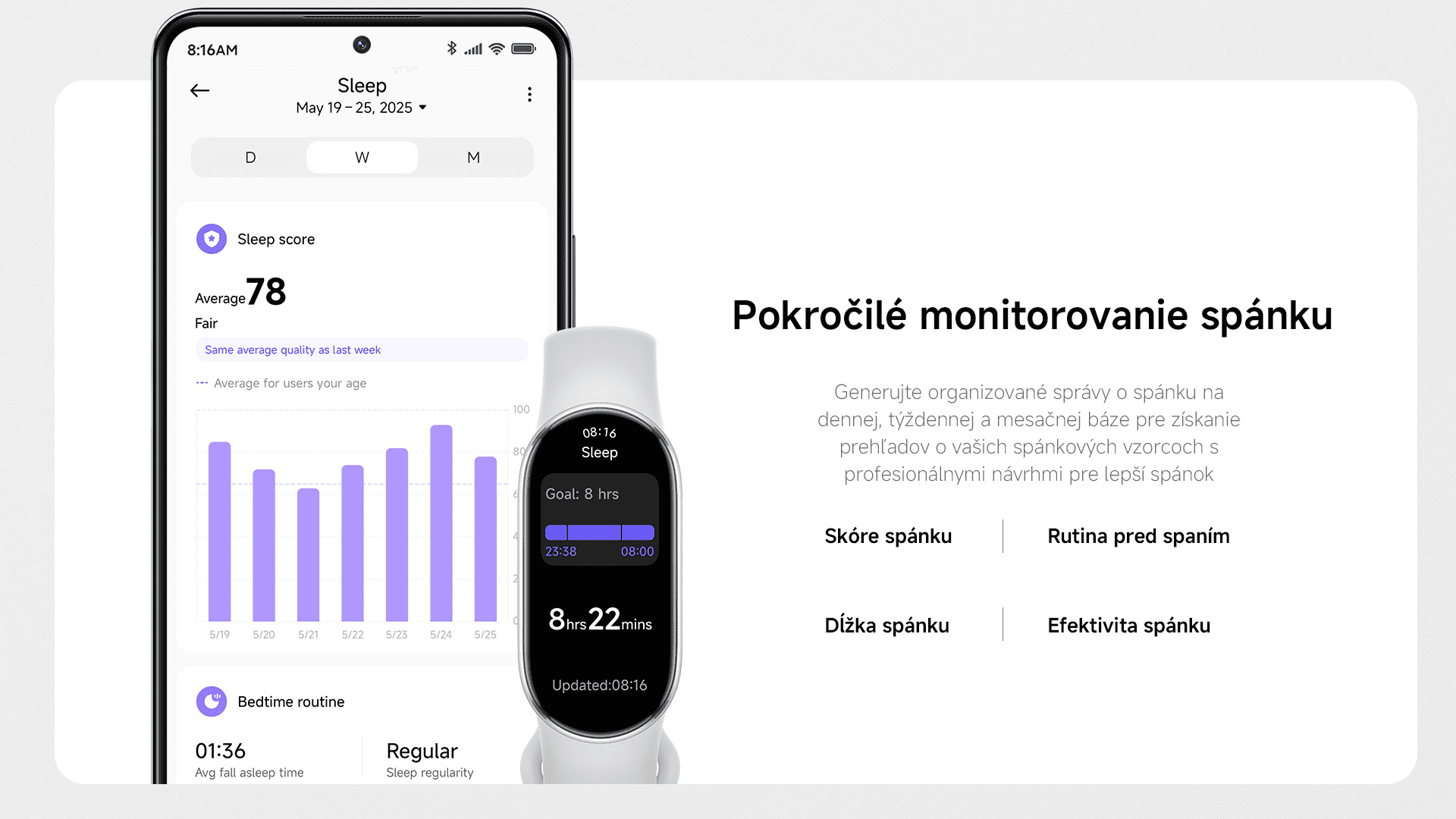 Vďaka presným snímačom môžete svoj spánok sledovať presnejšie ako kedykoľvek predtým. Náramok vám poskytne individuálne odporúčania a riešenia na optimalizáciu kvality vášho spánku. Na základe predošlých údajov o spánku vám vygeneruje inteligentný 21-dňový plán na optimalizáciu spánku. *Plán inteligentného zlepšenia spánku je potrebné aktivovať manuálne.