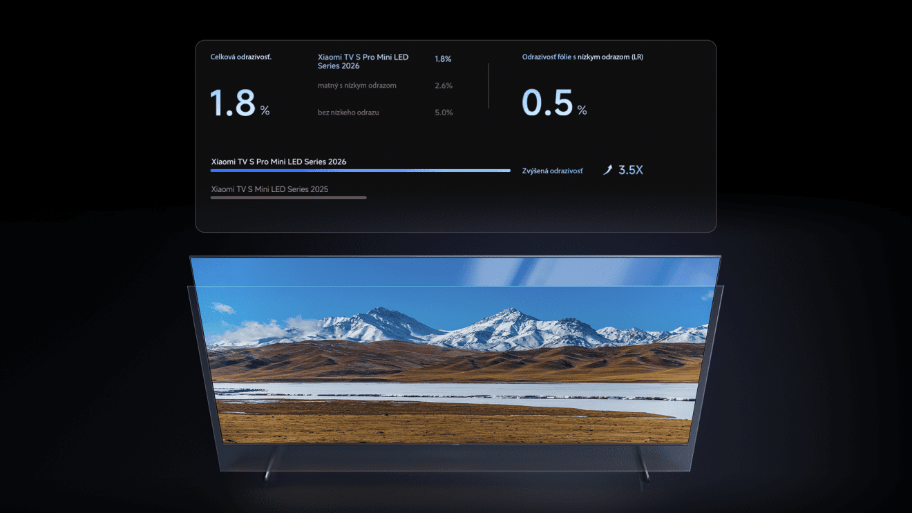 Televízor je vybavený špičkovým VA panelom a viacvrstvovou optickou štruktúrou, kde je každá vrstva presne kontrolovaná pre hrúbku a index lomu. To umožňuje deštruktívnu interferenciu prichádzajúceho svetla, čím sa výrazne znižujú odrazy na povrchu obrazovky. Povlak s nízkym odrazom znižuje celkovú odrazivosť obrazovky na iba 1,8%, čo prináša hlbšie čierne farby a vylepšený kontrast.