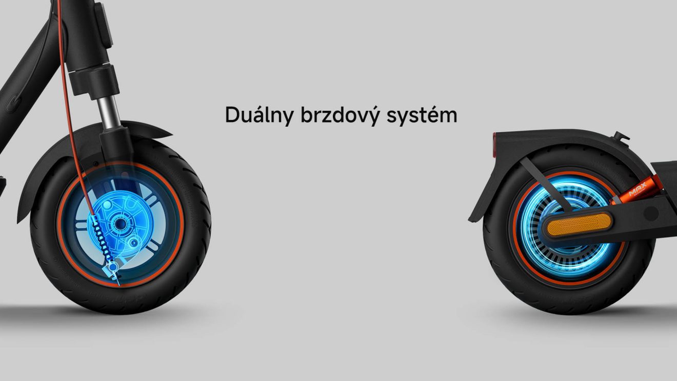 Kolobežka je vybavená mechanickou bubnovou brzdou predného kolesa a elektrickou E-ABS brzdou zadného kolesa. Ich kombinácia výrazne skracuje brzdnú dráhu, čím zvyšuje stabilitu a bezpečnosť.